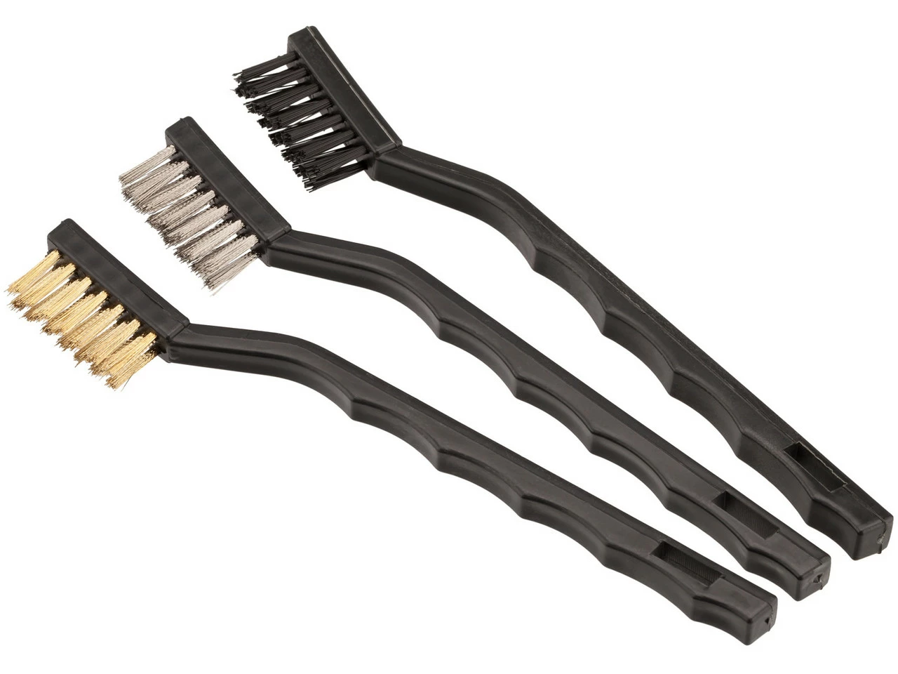 Das Bürstenset von 3min19sec umfasst drei Bürsten, mit denen Du leichte Oberflächenbearbeitungen und Reinigungsarbeiten am Rad durchführen kannst. Jede Bürste ist 120 mm lang und verfügt über einen ergonomisch geformten Kunststoff-Griff. Wie an den drei verschiedenen Borsten-Farben (gold, silber, schwarz) zu sehen ist, liegen drei unterschiedliche Materialien vor. Du erhältst also eine Messing-Bürste, eine Stahl-Bürste und eine Kunststoff-Bürste alle in einem Set. Dabei ist die Stahl-Ausführung die härteste, die Messing-Version mittelhart und die Kunststoff-Ausführung die weichste.