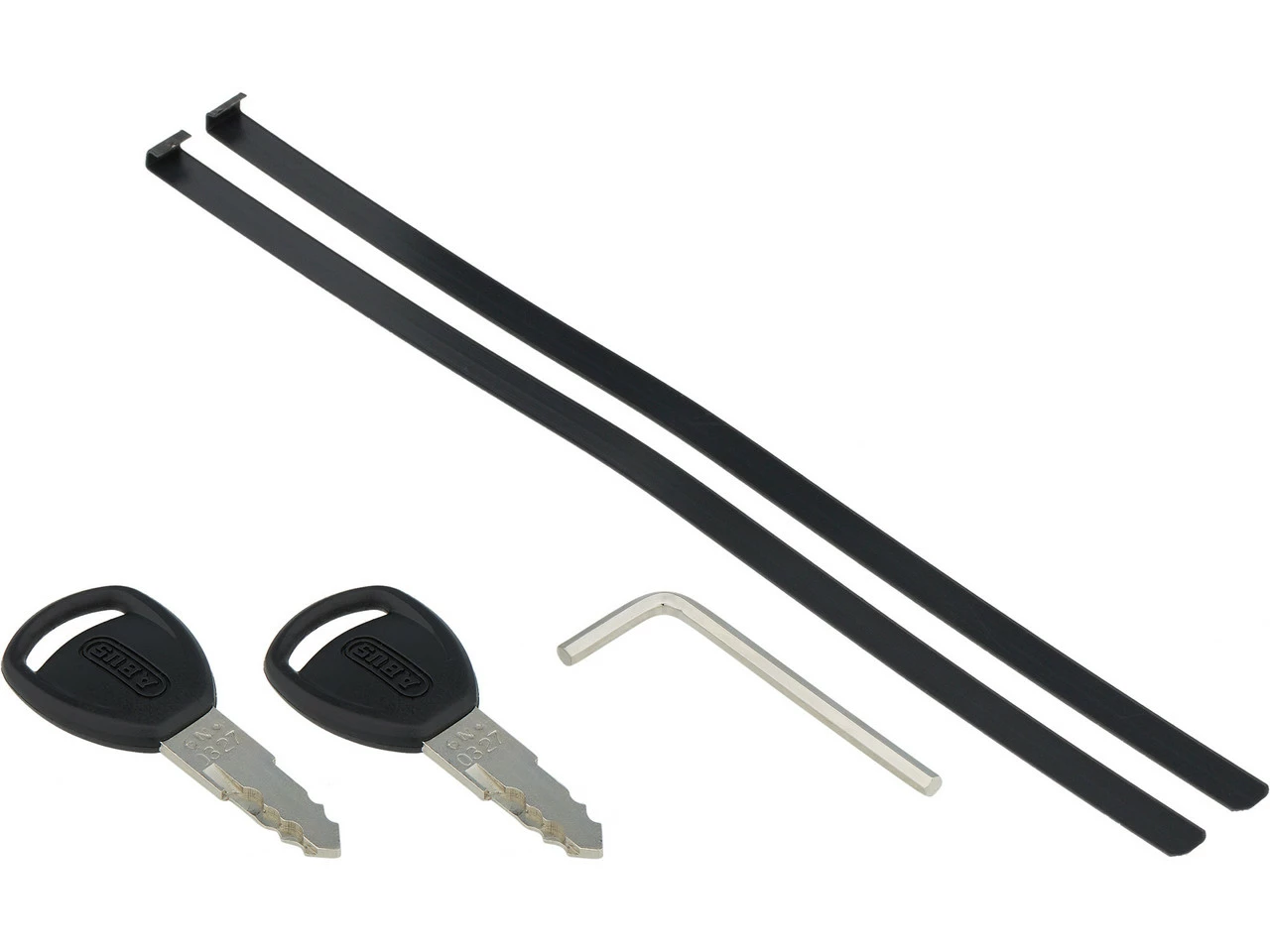 Lieferumfang:1 x ABUS Alarmbox 2.01 x Einsteckkette ABUS ACH 6KS 100 cm2 x Schlüssel2 x Spanngurt1 x Innensechskantschlüssel1 x Batterie CR2 (integriert)