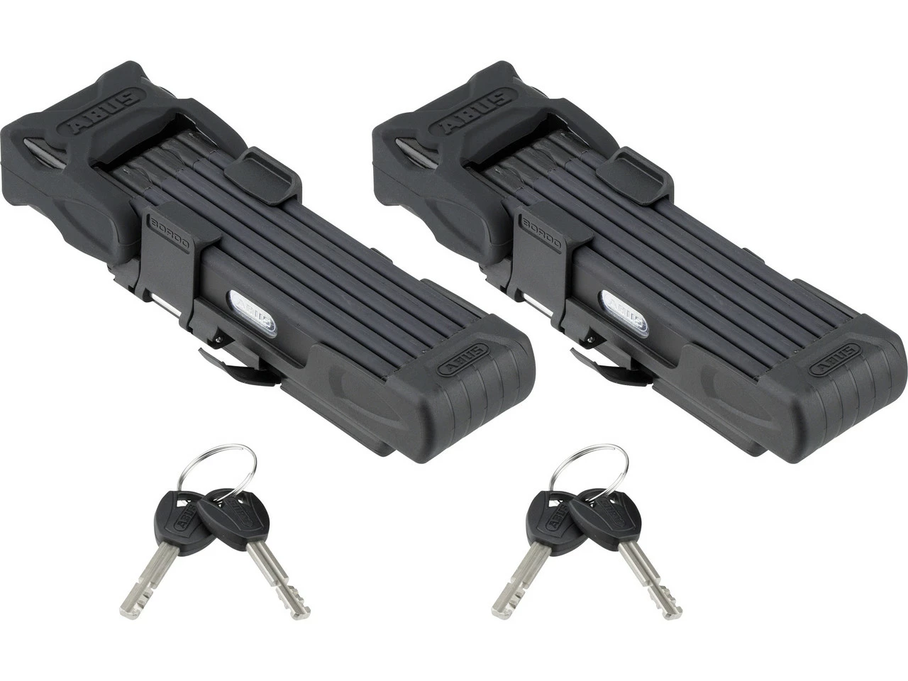 Lieferumfang:2 x Faltschloss ABUS Bordo 60002 x Halter ABUS SH 6000 mit Spannband-Halterung4 x Schlüssel ABUS