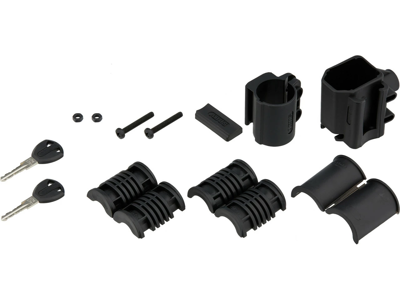 Lieferumfang:1 x Bügelschloss ABUS Facilo 321 x Schlaufenkabel ABUS Cobra 120 cm1 x Rahmenschelle ABUS USH1 x Schlossschelle ABUS USH2 x Schraube2 x Mutter1 x Rohreinsatz 14 – 18 mm1 x Rohreinsatz 19 – 24 mm1 x Rohreinsatz 25 – 30 mm1 x Rundeinsatz2 x Schlüssel