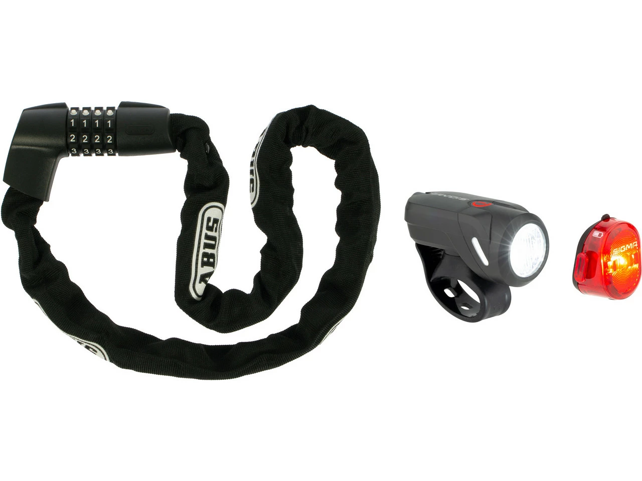 Lieferumfang:1 x Kettenschloss ABUS Tresor 13851 x Frontlicht Sigma Aura 35 USB1 x Halterung Sigma Frontlicht1 x Rücklicht Sigma Nugget II1 x O-Ring klein1 x O-Ring groß1 x Ladekabel Micro-USB