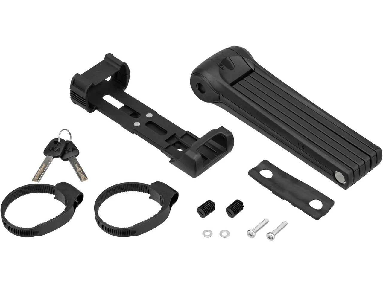 Lieferumfang:1 x Faltschloss Axa Fold 100 Pro1 x Halterung Axa2 x flexible Montageleisten Axa2 x Schrauben2 x Schlüssel Axa