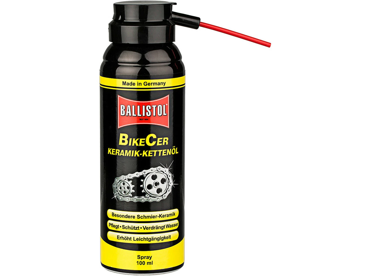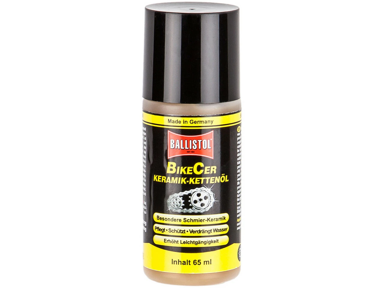 Bezeichnung:Keramik-Kettenöl BikeCer-SprayAnwendungsbereich:SchmiermittelFeatures:Keramik-Kettenölenthält besonderes Keramik-Additivpflegtschütztverdrängt Wassererhöht die Leichtgängigkeitdie Premiumpflege für Kette, Kassette und Ritzel, aber auch alle andern Fahrradbauteilesilikon-, PTFE-, säure- und harzfrei bzw. verharzt nichtWeitere Angaben nach Produkt:65 ml: