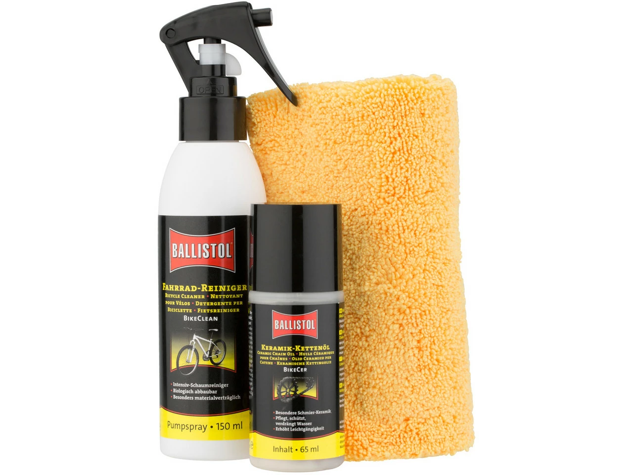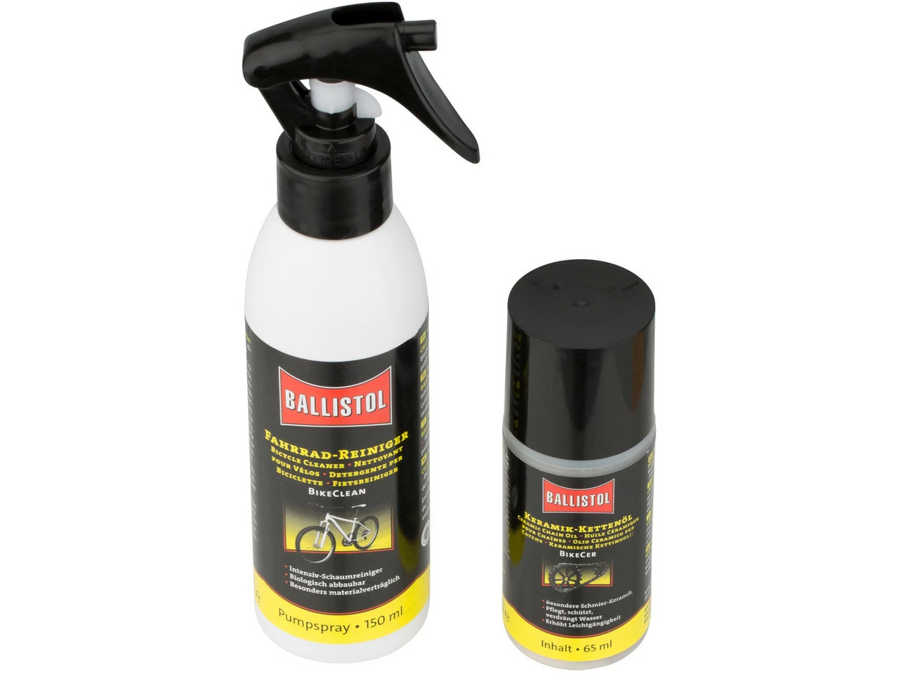 Mit dem Fahrradpflege-Set von Ballistol reinigst Du Dein Bike und schmierst und pflegst Deine Kette und die übrigen Antriebskomponenten.