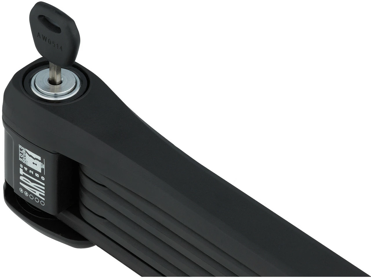 Spezifikationen:Bauweise:FaltschlossEinsatzbereich:City, Touring & TrekkingMaße (Länge x Stabstärke):90 cm x 0,8 cmVerschlussart:SchlüsselSicherheitsstufe:11 (von 12)Technische Daten:Länge:90 cmStabstärke:8 mmTestsiegel:Sold Secure Silver, ART-2Material Stäbe:StahlFeatures:äußerst diebstahlsicheres Faltschloss mit 8 mm starken Stäben aus gehärtetem StahlKunststoffummantelung zum Schutz vor LackschädenHalterung für Flaschenhaltermontage oder flexible Befestigung mit Klettriemen fast überall am RahmenHerstellernummer:2905457301