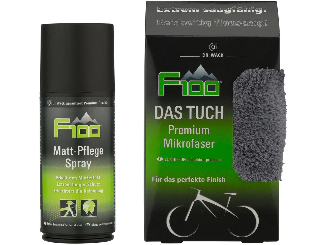 Das F100 Matt-Pflege Set von Dr. Wack ist speziell für die Reinigung, Pflege und den Schutz von matten Oberflächen, egal ob Lack oder Kunststoff, gedacht. Das F100 Matt-Pflege Spray bildet zusammen mit dem F100 Mikrofasertuch ein unschlagbares Team, wenn es um die Reinigung und den Erhalt vom matten Finish an Rahmen, Helm oder Komponenten geht. Dein Rad ist im Handumdrehen wieder sauber und ganz sicher nicht auf Hochglanz poliert!