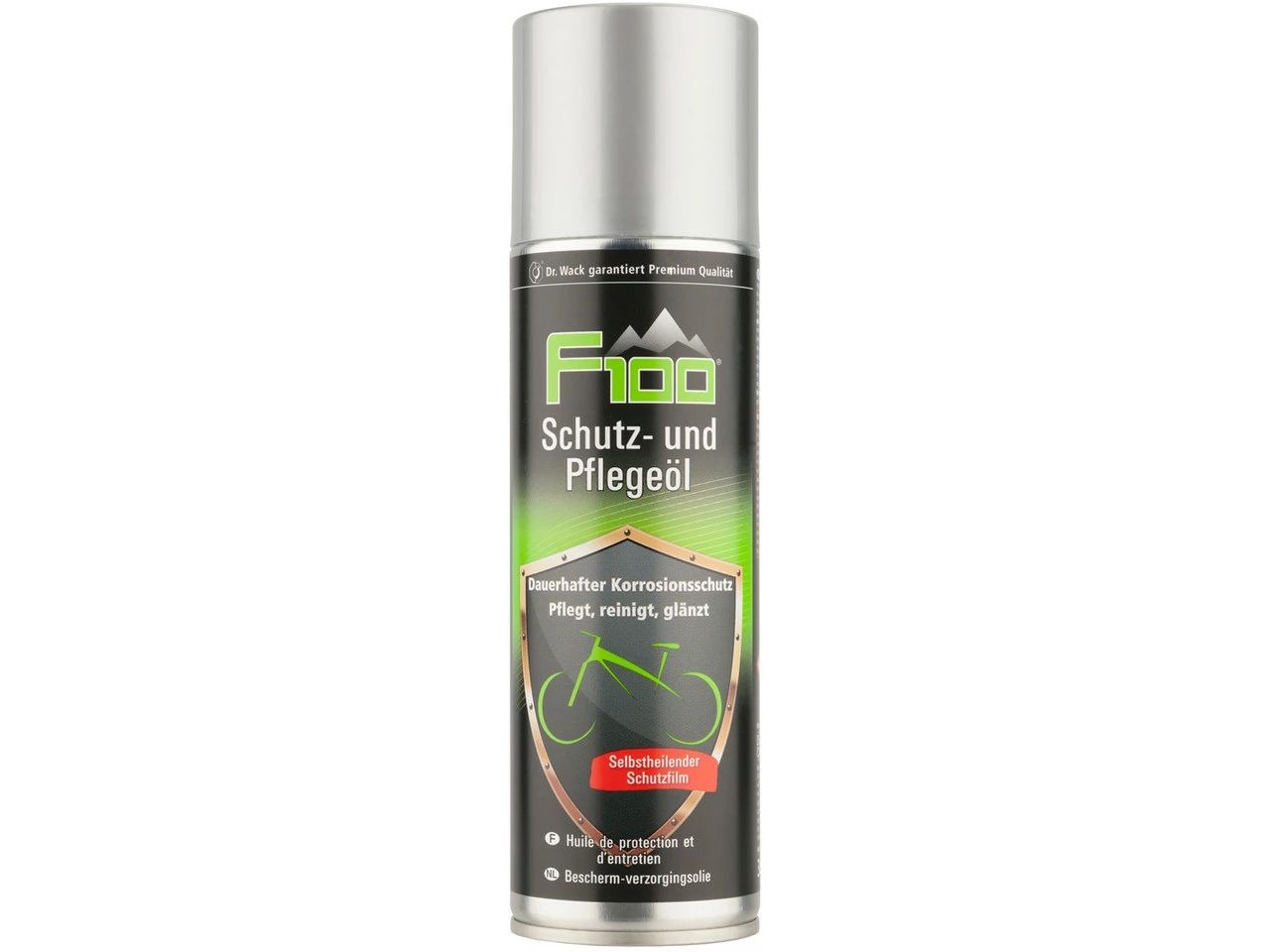 Spezifikationen:Bezeichnung:F100 Schutz- und PflegeölEinsatzbereich:Reinigung und Pflege von Rahmen und Fahrradteilen, Schutz vor KorrosionAnwendungsgebiet:sämtliche Oberflächen aus Metall, Kunststoff, CarbonFeatures:bietet zuverlässigen Schutz und stoppt vorhandene Korrosion (bei regelmäßiger Anwendung)hohes Kriechvermögentransparenter Schutzfilm gegen schädliche Umwelteinflüsseschonende Pflege und Reinigungbestens zur Winterstilllegung geeignetmit Lack, Gummi und Kunststoff verträglichkann problemlos mit F100 Fahrradreiniger entfernt werdenAnwendung:Dose vor Gebrauch schüttelnnur auf sauberen, trockenen Oberflächen anwendengleichmäßig und sparsam aufsprühenmit weichem Lappen nachwischen oder mit getränktem Lappen auftragenfür Winterstilllegung satt aufsprühen (ohne Nachwischen)