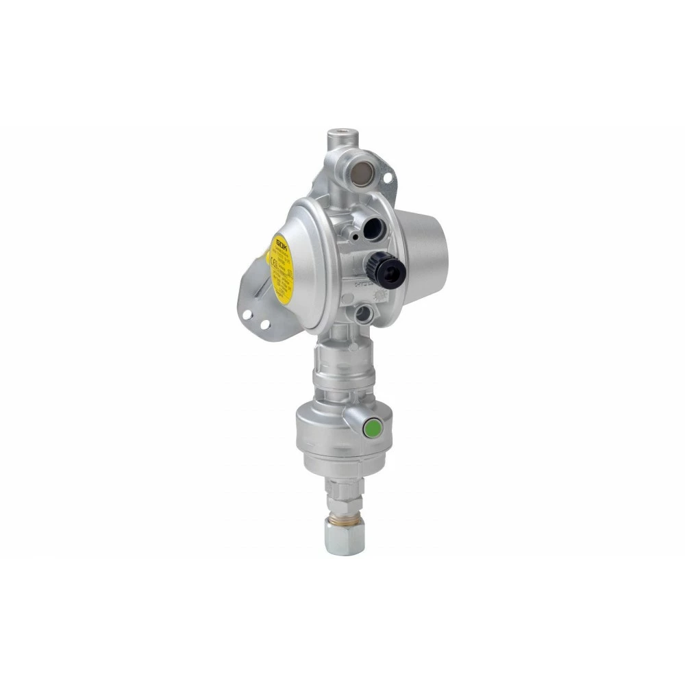 Niederdruckregler mit Sicherheitsabblaseventil PRV, mechanischem Crash-Sensor, Bedienknopf, Gasrücktrittsicherung, Prüfeinrichtung und Wandhalterung