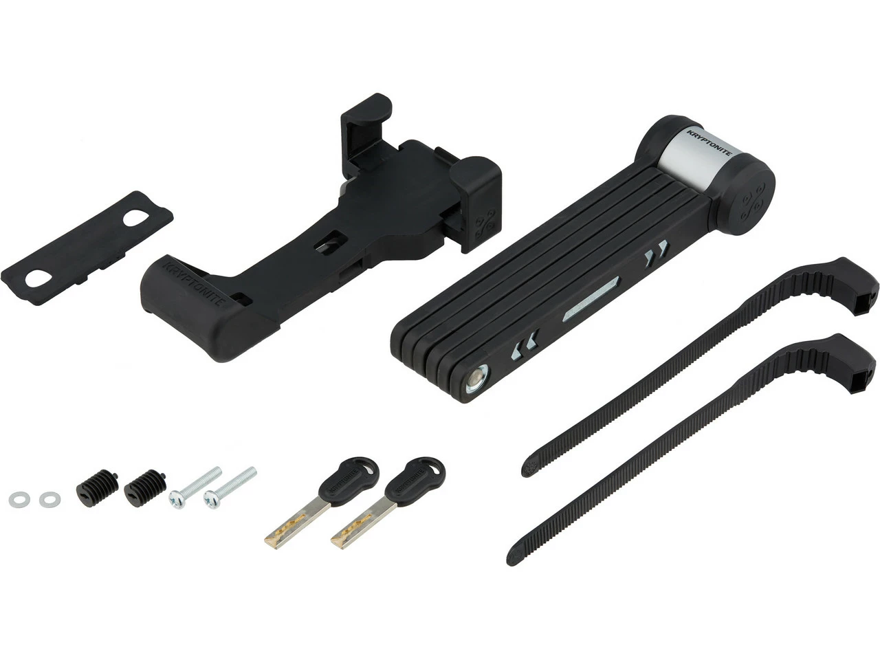 Lieferumfang: 1 x Faltschloss Kryptonite KryptoLok 610S1 x Rahmenhalterung Kryptonite KryptoLok 610S2 x Schlüssel Kryptonite2 x Befestigungslasche1 x Unterlegscheibe2 x Schraube2 x Bandschraube2 x Mutter