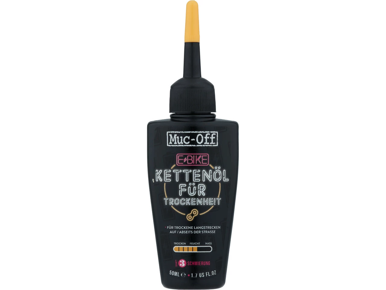 Spezifikationen:Bezeichnung:MUC-Off EBIKE DRY LUBE/ Kettenöl für TrockenheitAnwendungsbereich:SchmiermittelFeatures:speziell für die höheren Belastungen von E-Bike-Ketten entwickelterzeugt eine trockene Keramikschicht für mehr Haltbarkeit und Performance im Trockenenmit Bornitrid-Bestandteilenultrageringe Reibung für einzigartige Schmierungzieht keinen Staub anbasiert auf biologisch abbaubaren organischen Komponentenfür Road und OffroadUV-Färbemittel hilft bei der AnwendungAnwendung:Kette vollständig entfetten und trocknenFlasche stark schüttelnauf alle Teile der Kette auftragenidealerweise 3 bis 4 Stunden vor der Ausfahrt auftragenüberschüssiges Schmiermittel mit einem Tuch wegwischenHinweise des Herstellers:Kontakt des Schmiermittels mit den Bremsen vermeiden. Schutzhandschuhe tragen.