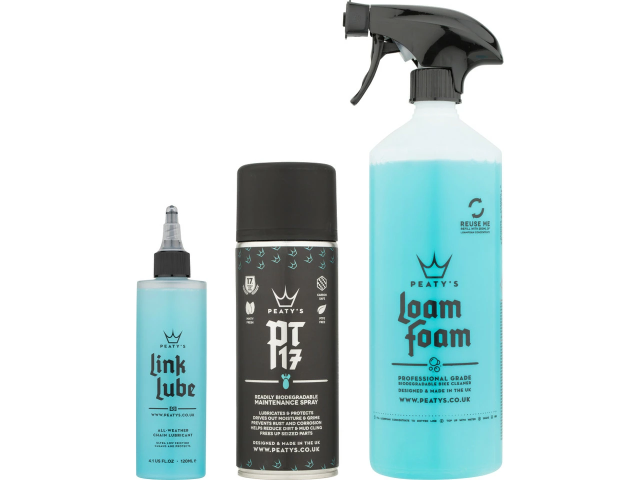 Lieferumfang:1 x Reinigerlösung Peaty’s Loam Foam Bike Cleaner, 1000 ml1 x Spray Peaty’s PT17 Maintenance, 400 ml1 x Kettenöl Peaty’s Link Lube All-Weather, 120 ml1 x Sprühkopf